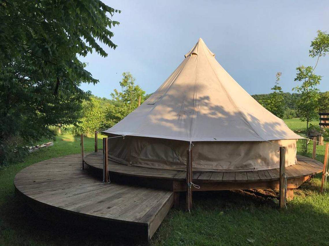 Description: A yurt is a circular tent draped atop a wood lattice. This one, made in the USA, is 40 feet above Elkhorn Creek near Peaks Mill. There’s no running water, but there is a Yeti cooler, supply of drinking water and water for dishes, as well as an “evaporative toilet,” which converts human waste into a lightweight odorless product. “It’s an artful building,” the site description says of the toilet building. $95 a night, $115 with fees.