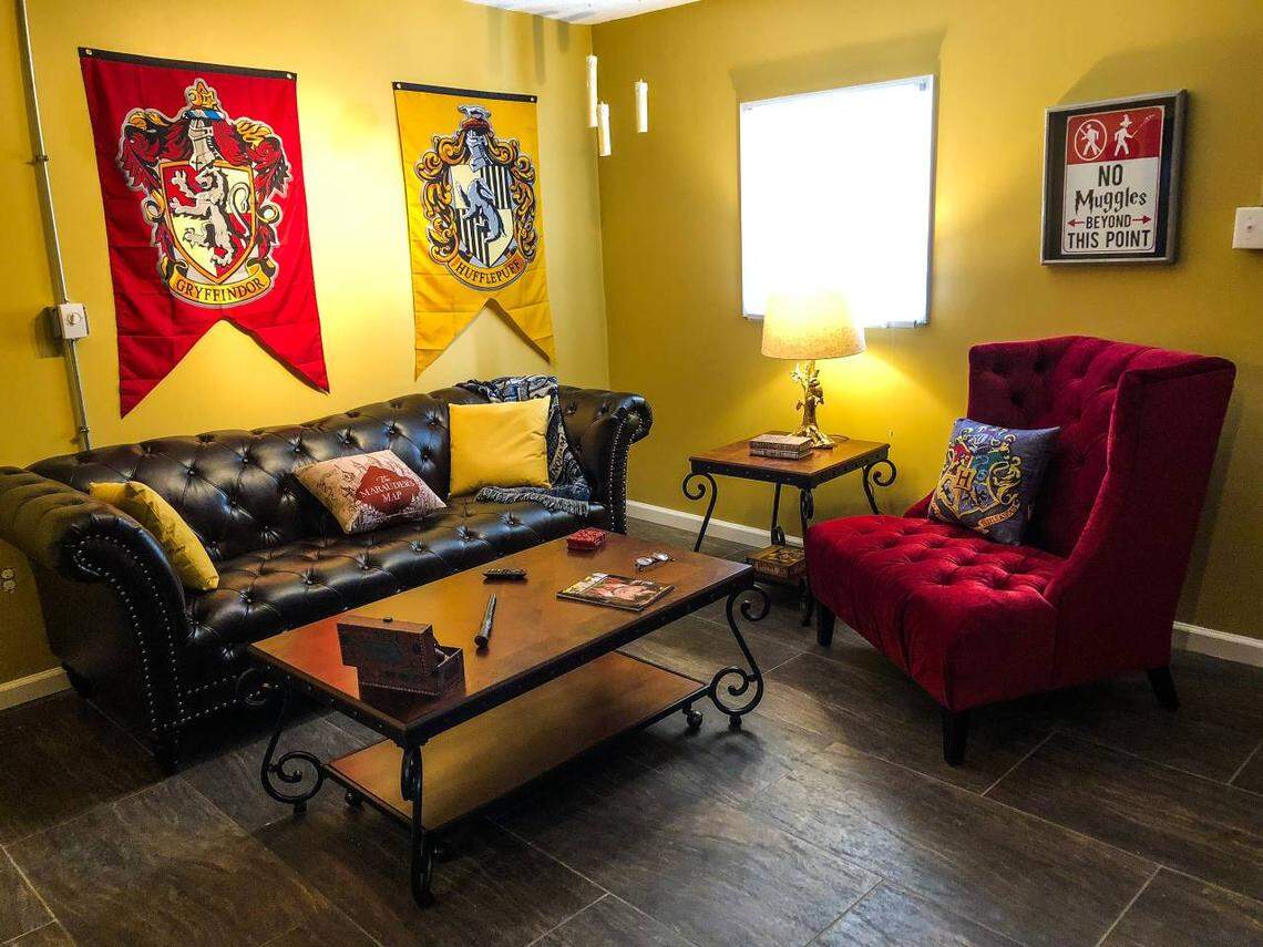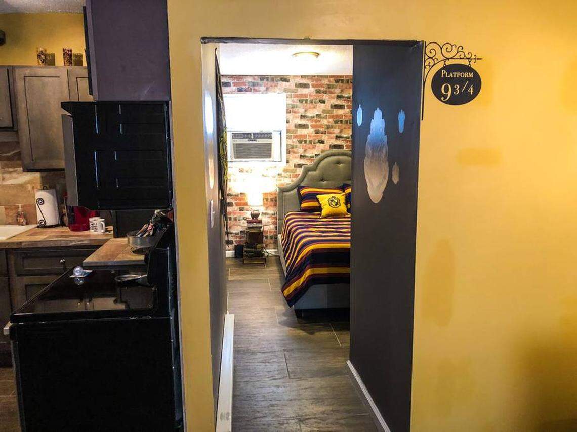 Description: We had a little disagreement among ourselves about this one, as it is targeted toward the hard-core Harry Potter fan who can truly appreciate an apartment with faux dripping candles, pennants for Gryffindor and Hufflepuff, owl lamps and an entrance to platform 9 3/4.