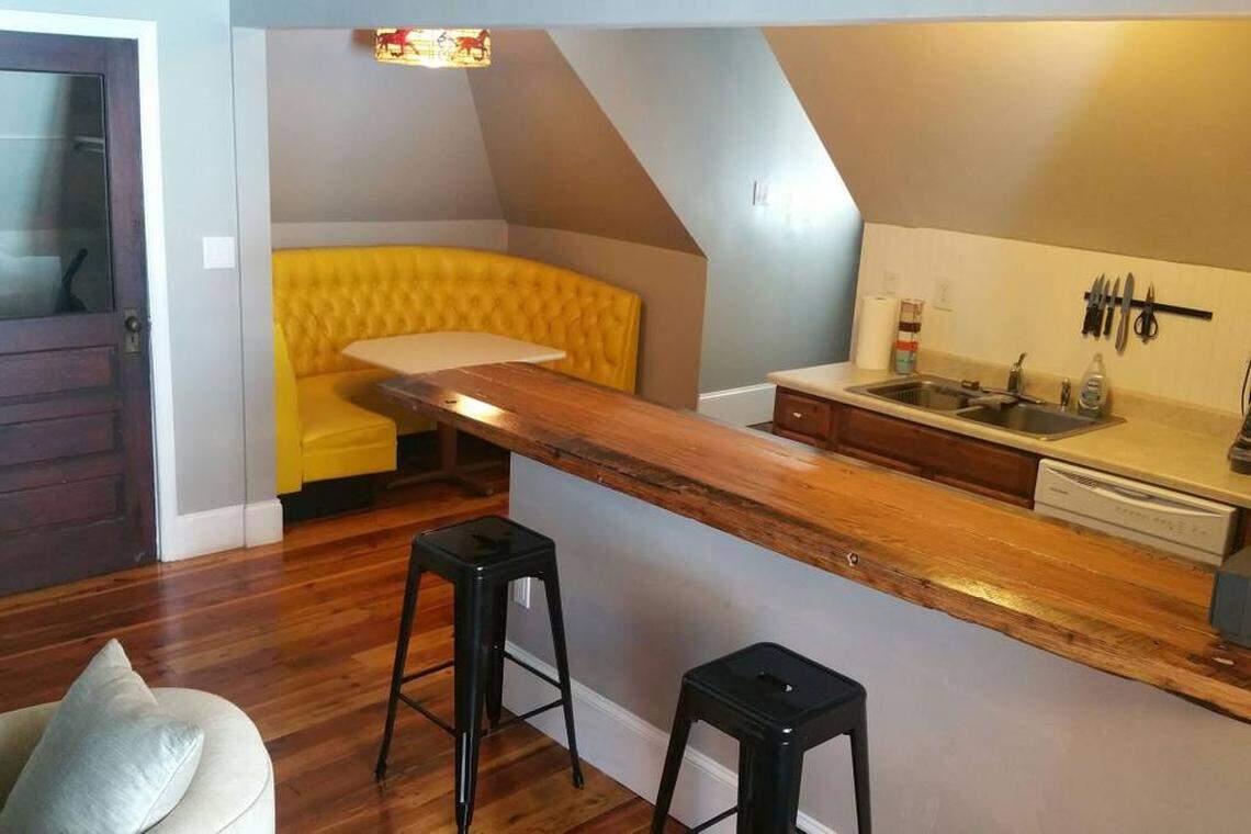 Description: Reclaimed yellow booth seating from once-beloved but now defunct Mexican restaurant chain Chi-Chi’s. Up three flights of stairs, an 850-square foot attic apartment with two bedrooms. Reclaimed wood floors. $40 per night, with fees $91 total.