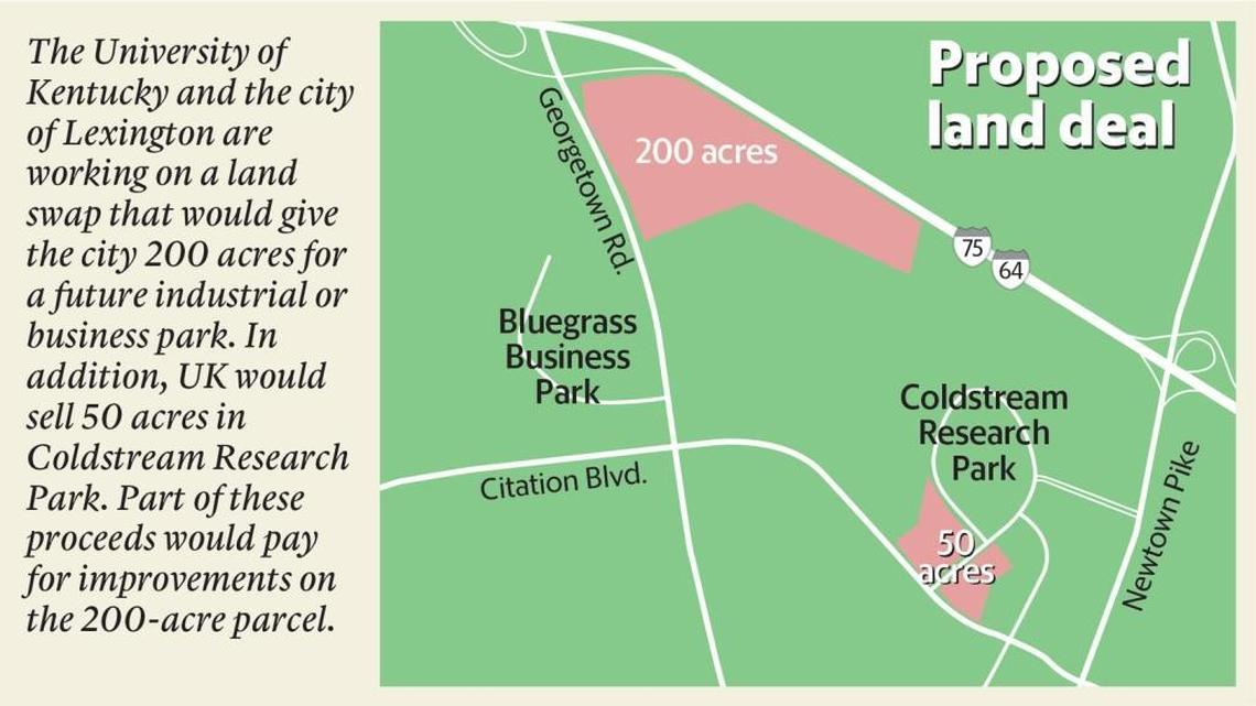 Lexington and the University of Kentucky are in negotiations for a swap that would give the city more than 200 acres of land near Interstates 64 and 75 for an industrial or business park. In exchange, UK would get control of portions of approximately 13 acres of roads on and around campus.