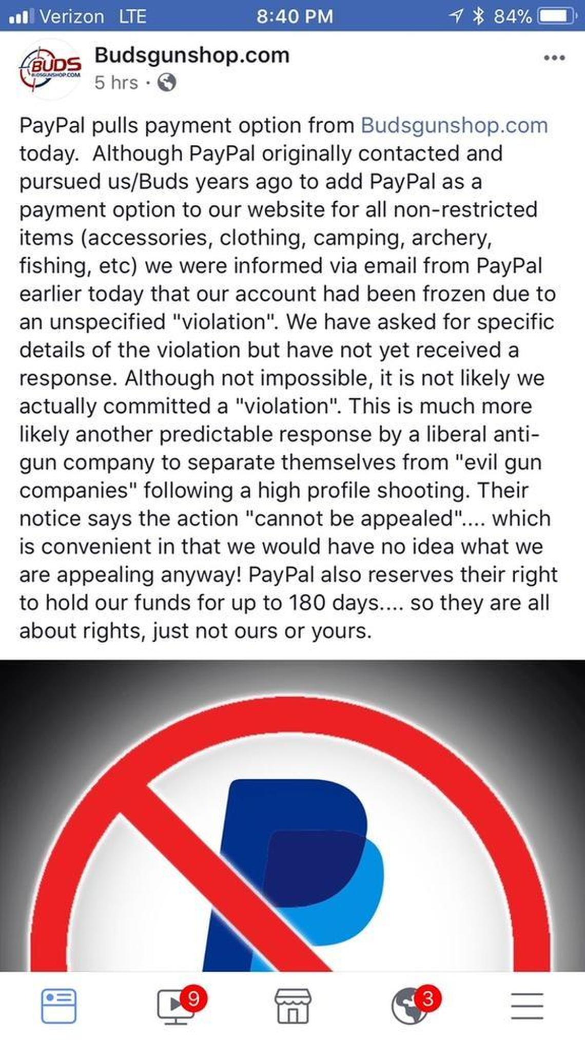 PayPal can not be used to purchase guns and ammunition, but Buds said in a Facebook post Friday night that its PayPal account is used to pay for “non-restrictive items,” such as camping gear, archery equipment, clothing and fishing gear.