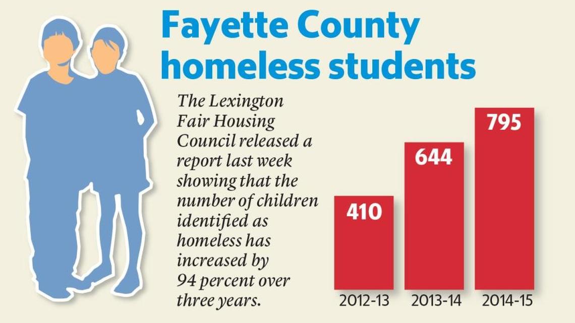 The Lexington Fair Housing Council’s analysis of local and state education data show that the number of homeless students in the county jumped from 410 in the 2012-13 school year to 795 in the 2014-15 school year. That’s an increase of 94 percent.