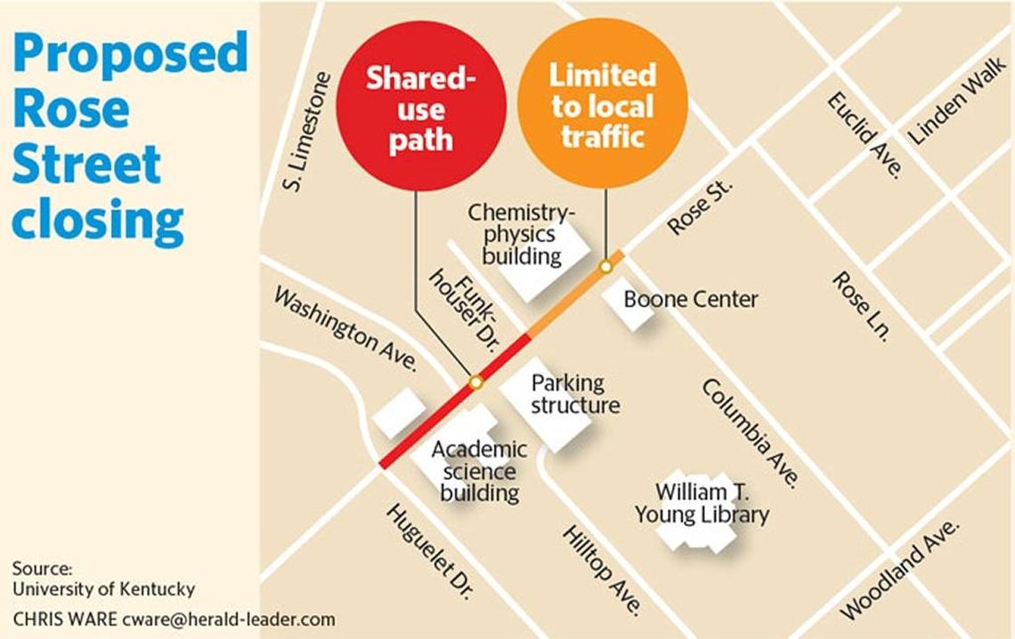 Hollinger said other conditions the city would like to see addressed include allowing fire and police to review the designs of the street closure to ensure that fire trucks and ambulances can access the street. Future changes to Rose Street must also get approval. UK must also assume responsibility for 11 street lights on that section of the street.