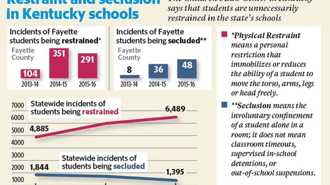 The report from the center, which has offices in Lexington and Covington, cites Kentucky Department of Education numbers that show students were restrained 5,985 times during the 2014-15 school year, up from 4,885 restraints reported for the 2013-14 school year. For the 2015-16 school year, the number continued to rise to 6,489.
