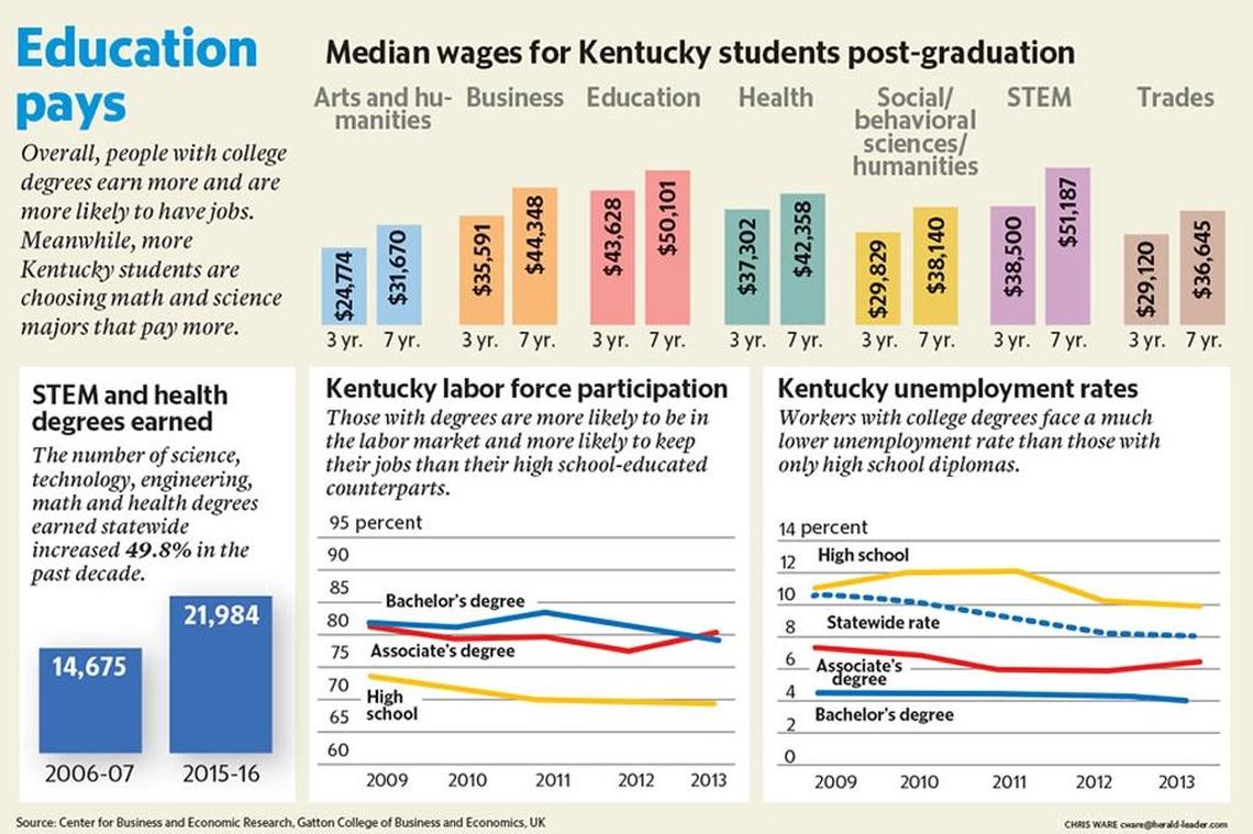 It’s true that Kentuckians who graduate with arts and humanities degrees make less than those who graduate with STEM (science, technology, engineering and math) degrees, according to the Kentucky Center for Education and Workforce. Seven years after graduation, those with arts and humanities degrees have a median income of $31,670 in Kentucky. For STEM graduates, the median income is $51,187, which is only slightly above the median wage of $50,101 for education majors.