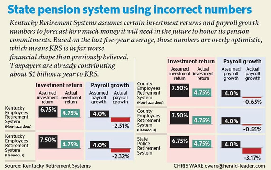 For example, KRS assumed that it would earn an average of 6.75 percent to 7.5 percent on money it invested, but it earned an average of 4.75 percent, Farris said. KRS assumed that public payroll would grow by 4 percent a year through pay raises or more government hiring — a larger payroll means larger pension contributions by employees — but public payroll has dropped overall because of repeated budget cuts, he said.
