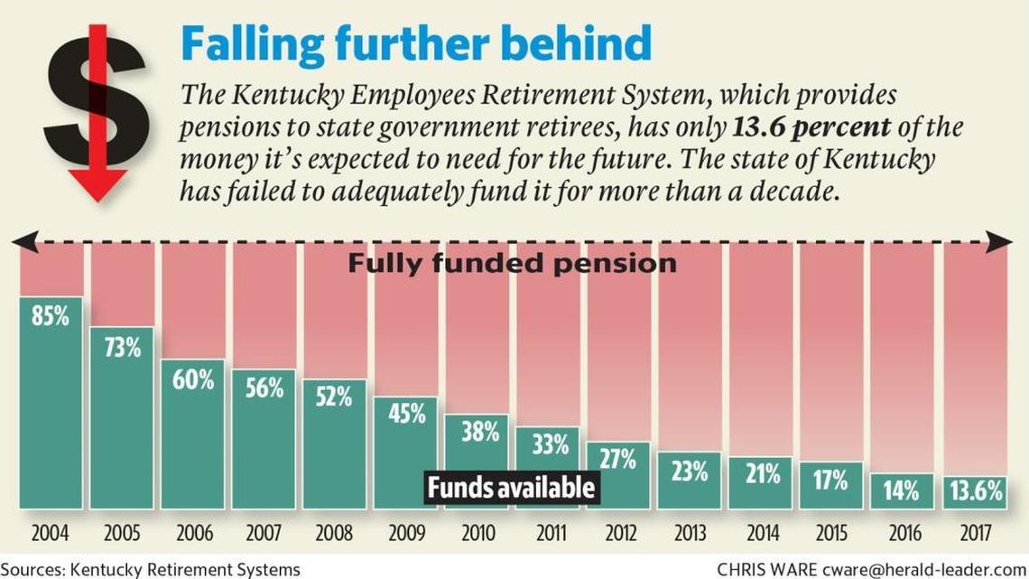 Funding level of Kentucky Employees System (Non-Hazardous) - state government's largest pension fund - was 13.6% on June 30 of this year, KRS board told. $13.4 billion unfunded liability. ^JC