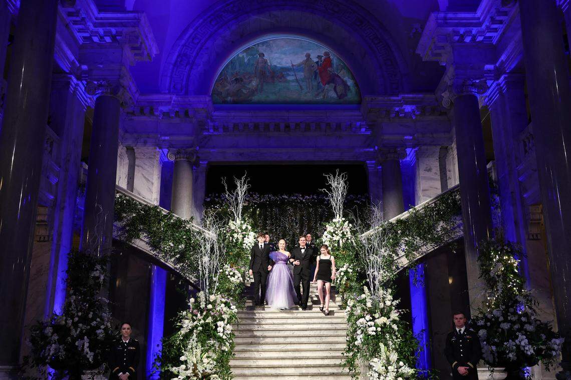 6:30 p.m. - Beshear and Lt. Gov. Jacqueline Coleman and their families, along with the other elected constitutional officers who will be sworn in Jan. 1, were presented in the Capitol Rotunda, which was lit in blue and festooned with floral garland for the inaugural ball.