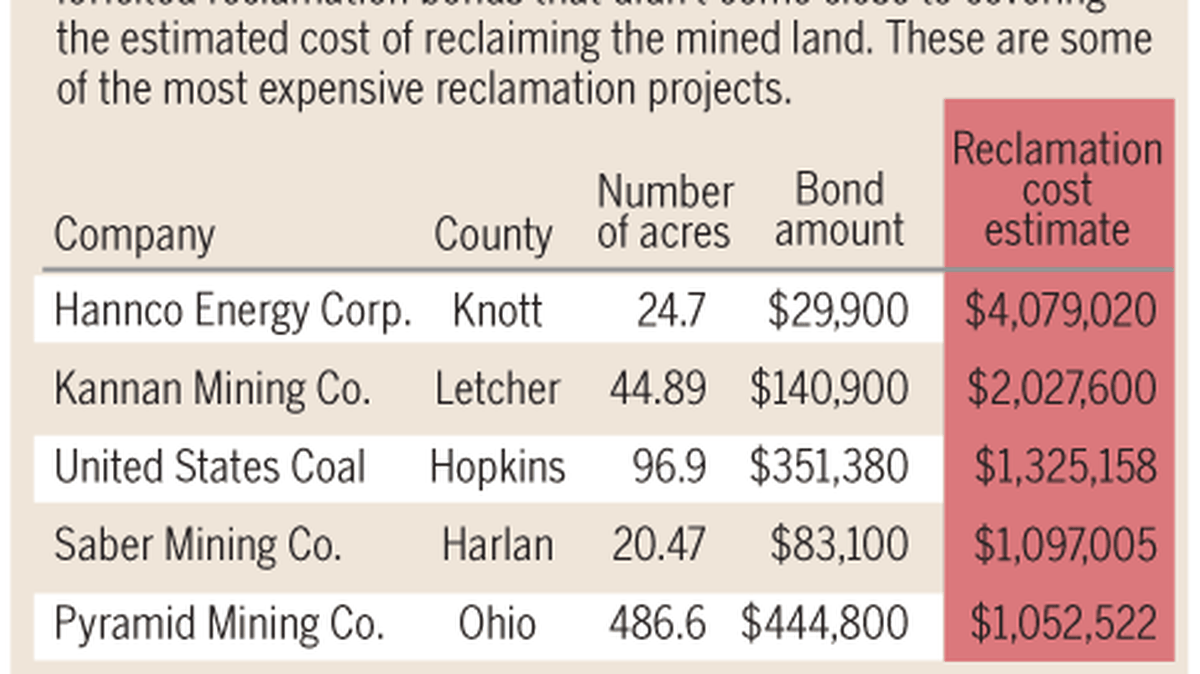 As the law requires, Hannco eventually forfeited its reclamation bond to pay the state for cleaning up its mess. But the bond — $29,900 — fell far short of the expected expense, putting the land's future in question. It was one of at least 32 examples in recent years of Kentucky coal operators posting bonds inadequate to reclaim mine sites after they disappeared.