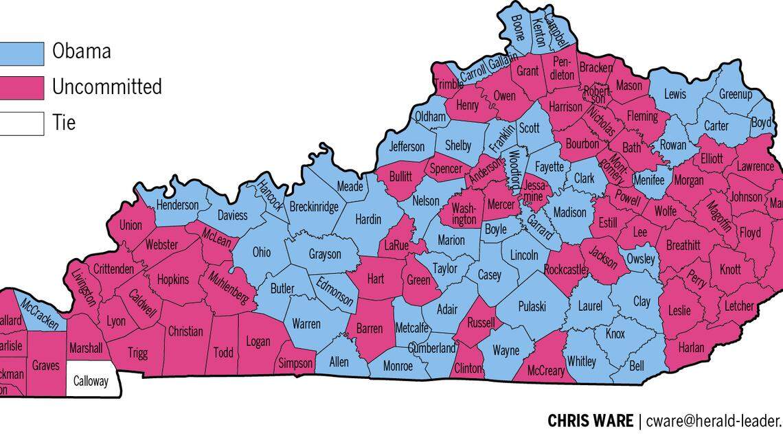 If Fayette and Jefferson counties were removed from the vote count in the sparsely attended election, "uncommitted" would have bested the president. "Uncommitted" received the majority of votes in 67 counties, compared to Obama's 52 counties. In Calloway County, it was a tie.