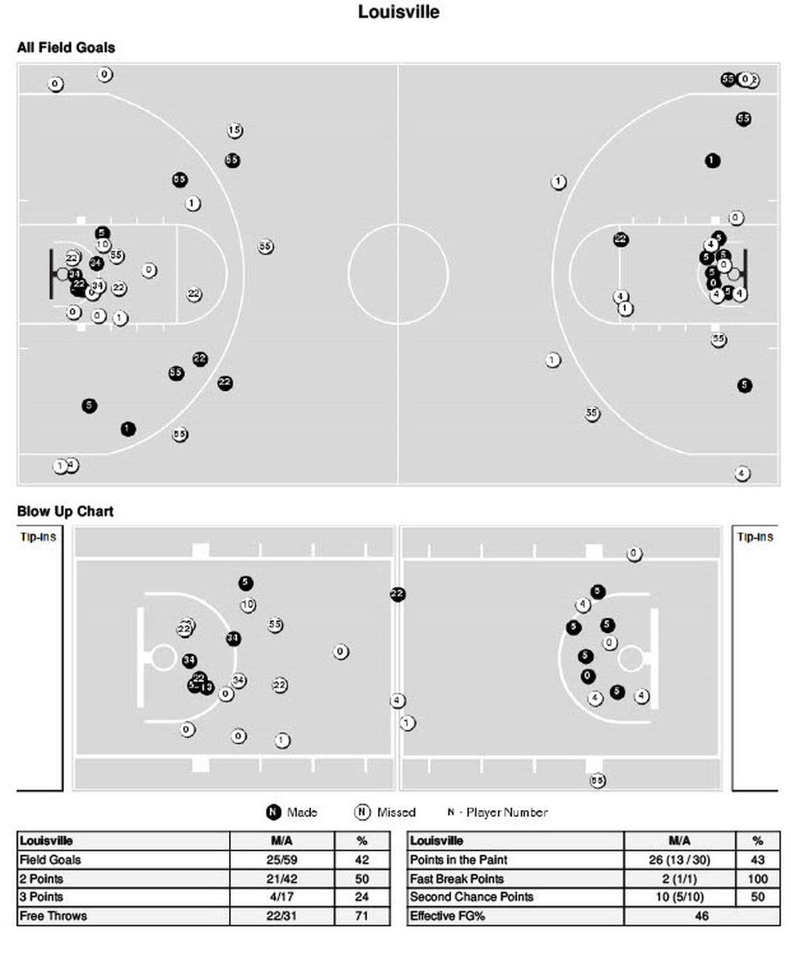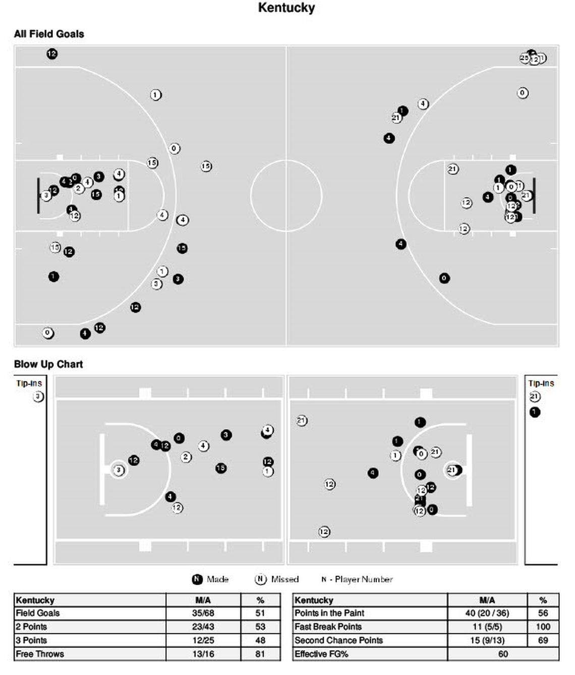 Shot chart from No. 9 Kentucky basketball’s 95-76 win over Louisville
