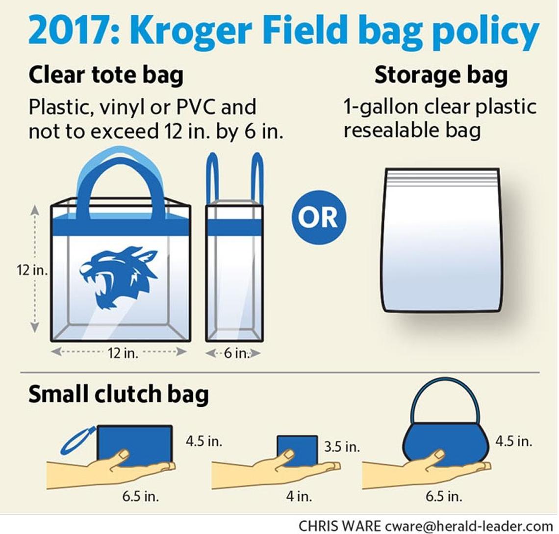 Compliant bags are available for purchase through the UK Bookstore. Fans not carrying any bags will be able to enter Kroger Field through specially marked bag-free admissions entries at each gate.