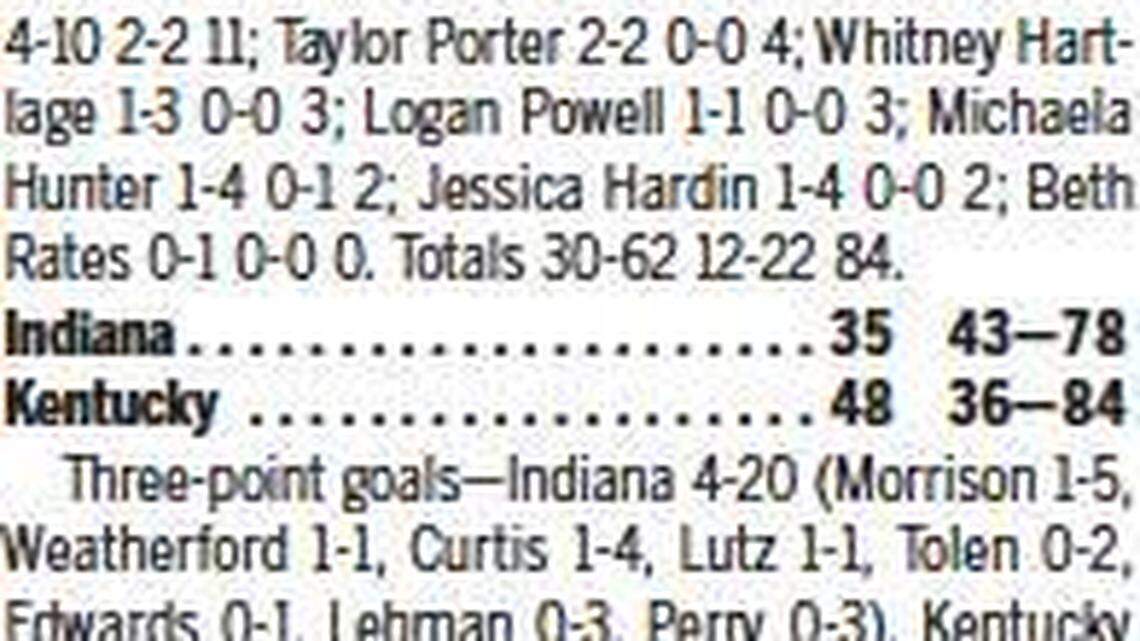 Three-point goals—Indiana 4-20 (Morrison 1-5, Weatherford 1-1, Curtis 1-4, Lutz 1-1, Tolen 0-2, Edwards 0-1, Lehman 0-3, Perry 0-3), Kentucky 12-25 (Feldhaus 6-8, Goodin-Rogers 1-2, Powell 1-1, Epps 1-1, Brooks 1-4, Dow 1-4, Hartlage 1-2, Hardin 0-2, Hunter 0-1). Fouled out—None. Rebounds—Indiana 47 (Lehman 8), Kentucky 31 (Epps 7). Assists—Indiana 16 (Weatherford 3, Lutz 3, Reimer 3), Kentucky 18 (Epps 10). Total fouls—Indiana 17, Kentucky 17. Technical fouls—None. A—n/a.